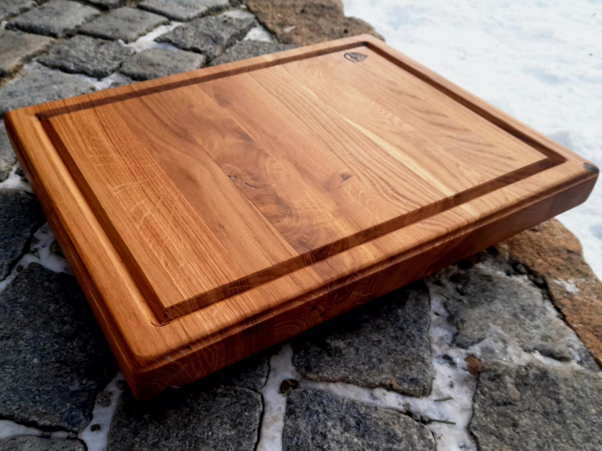 Masivní dubové steakové prkno s rustikální hranou a drážkou na šťávu. Oboustranné provedení, ruční výroba, extra tloušťka 4 cm.
