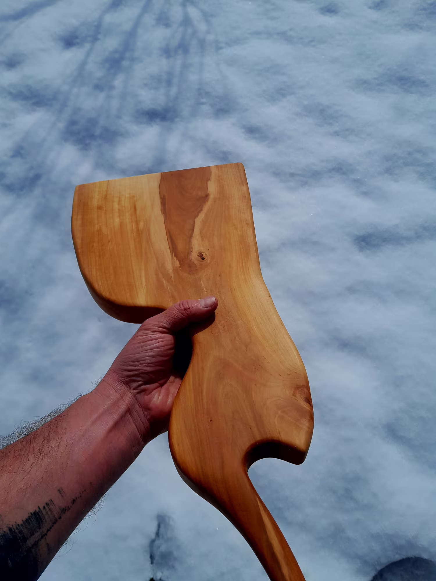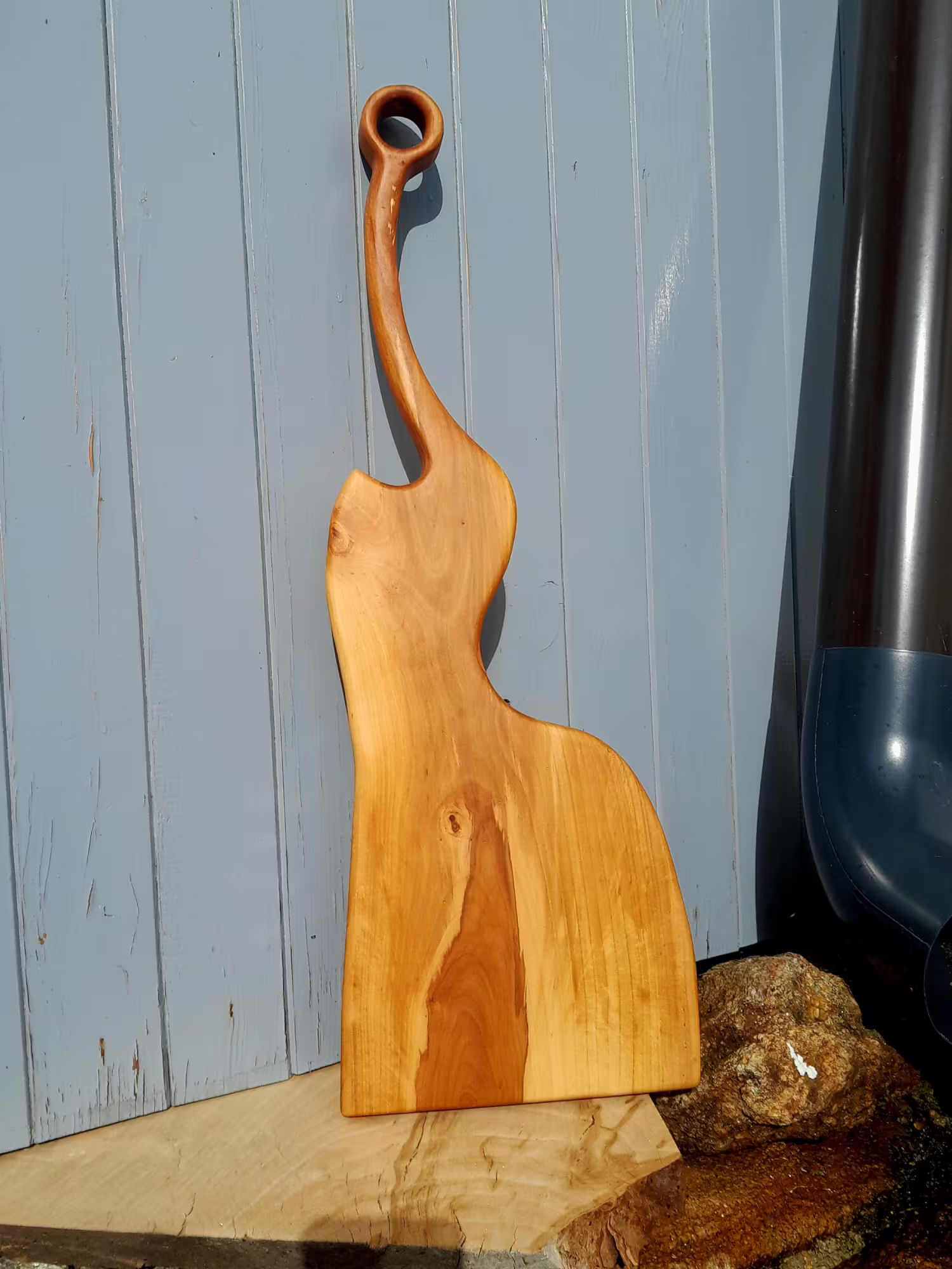 Tvar tohoto třetího kusu volně vychází z abstrakce plodu hrušky. Nejde o doslovný motiv, ale o náznak – o hmotu, křivku a plynulý přechod tvarů. Výrazná, ručně tvarovaná rukojeť s očkem dodává prknu sochařský charakter a zároveň praktickou funkci pro držení i zavěšení.
