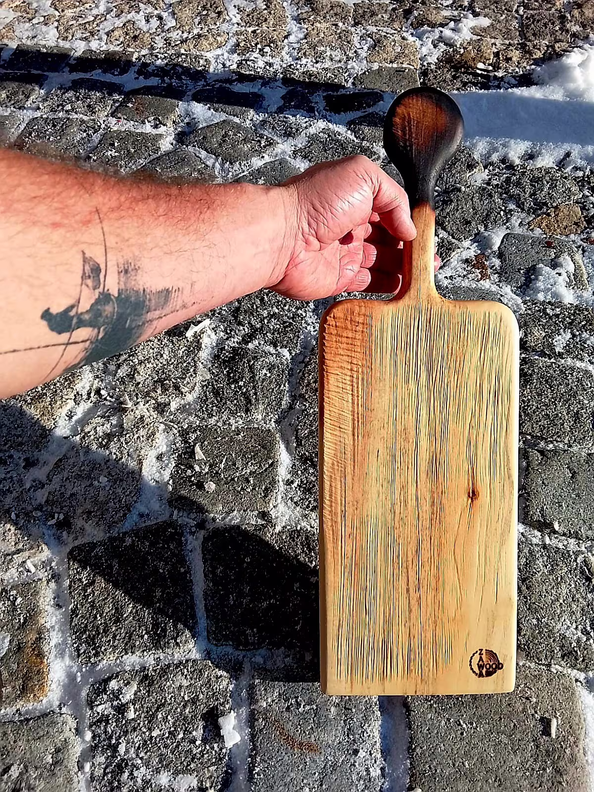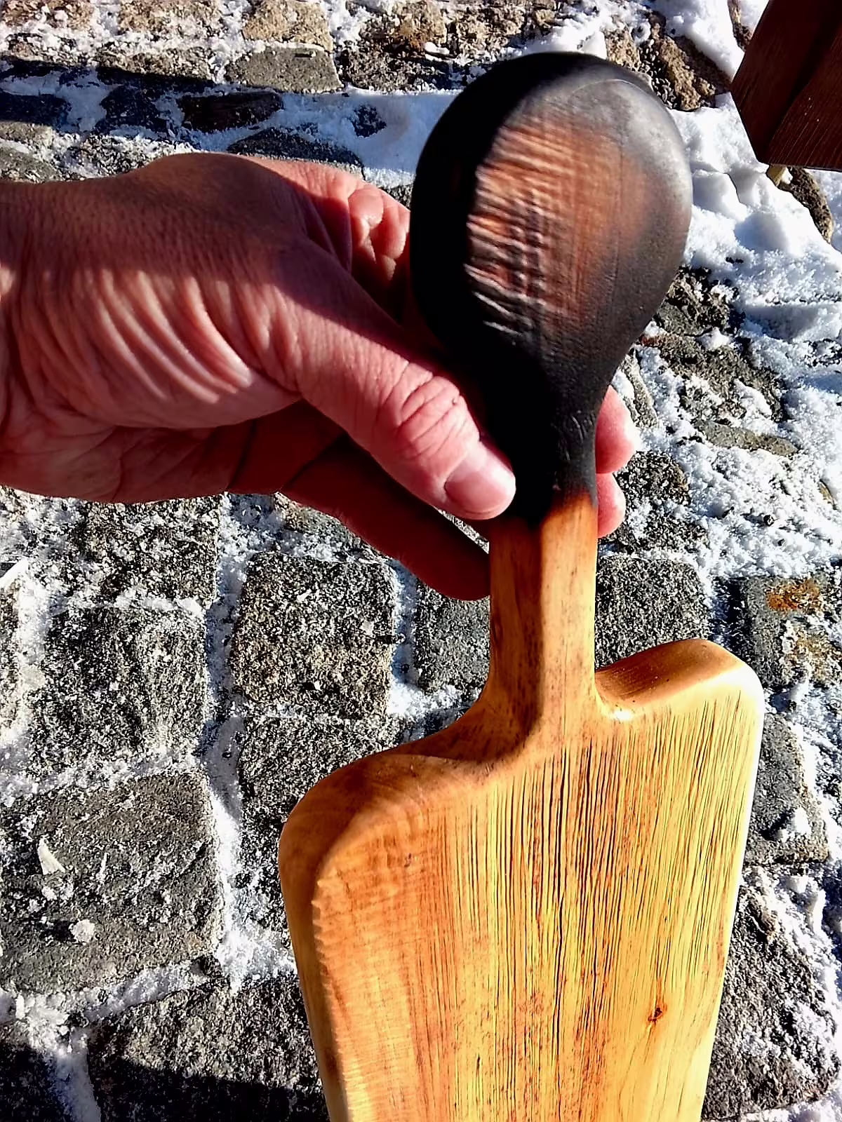 Zápalka I je první z trojice originálních prkének vzniklých ze stejného prastarého kaštanu. Dřevo v sobě nese paměť místa i času – jemné barevné přechody, kouřové tóny a kresbu, kterou vytvořily roky působení vody a mrazu.