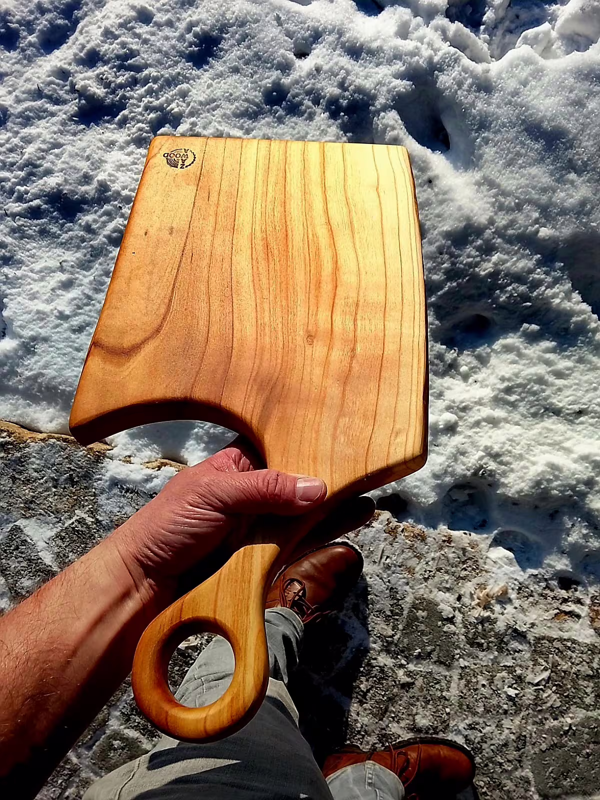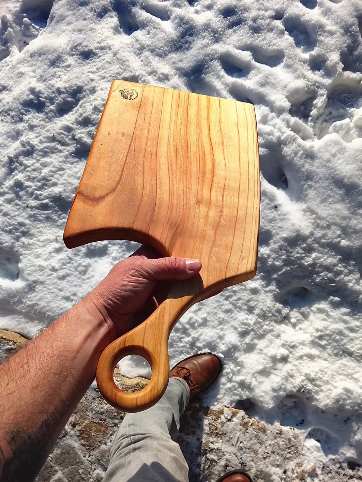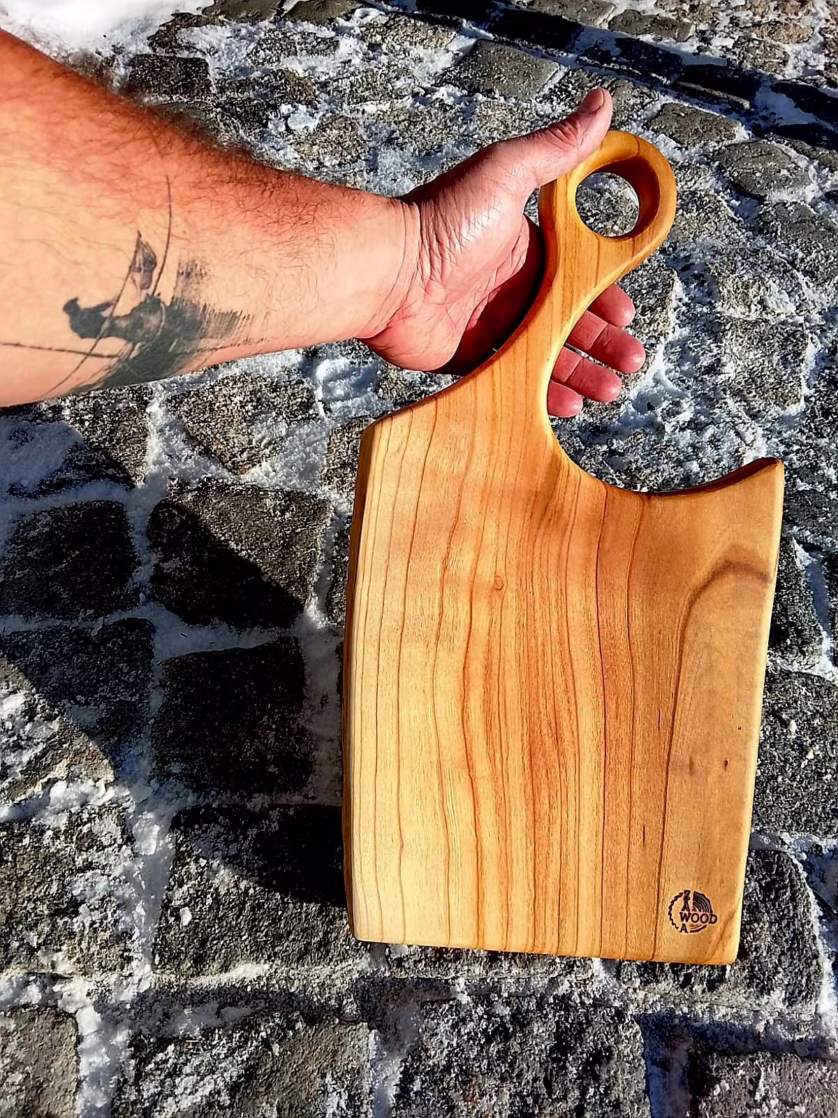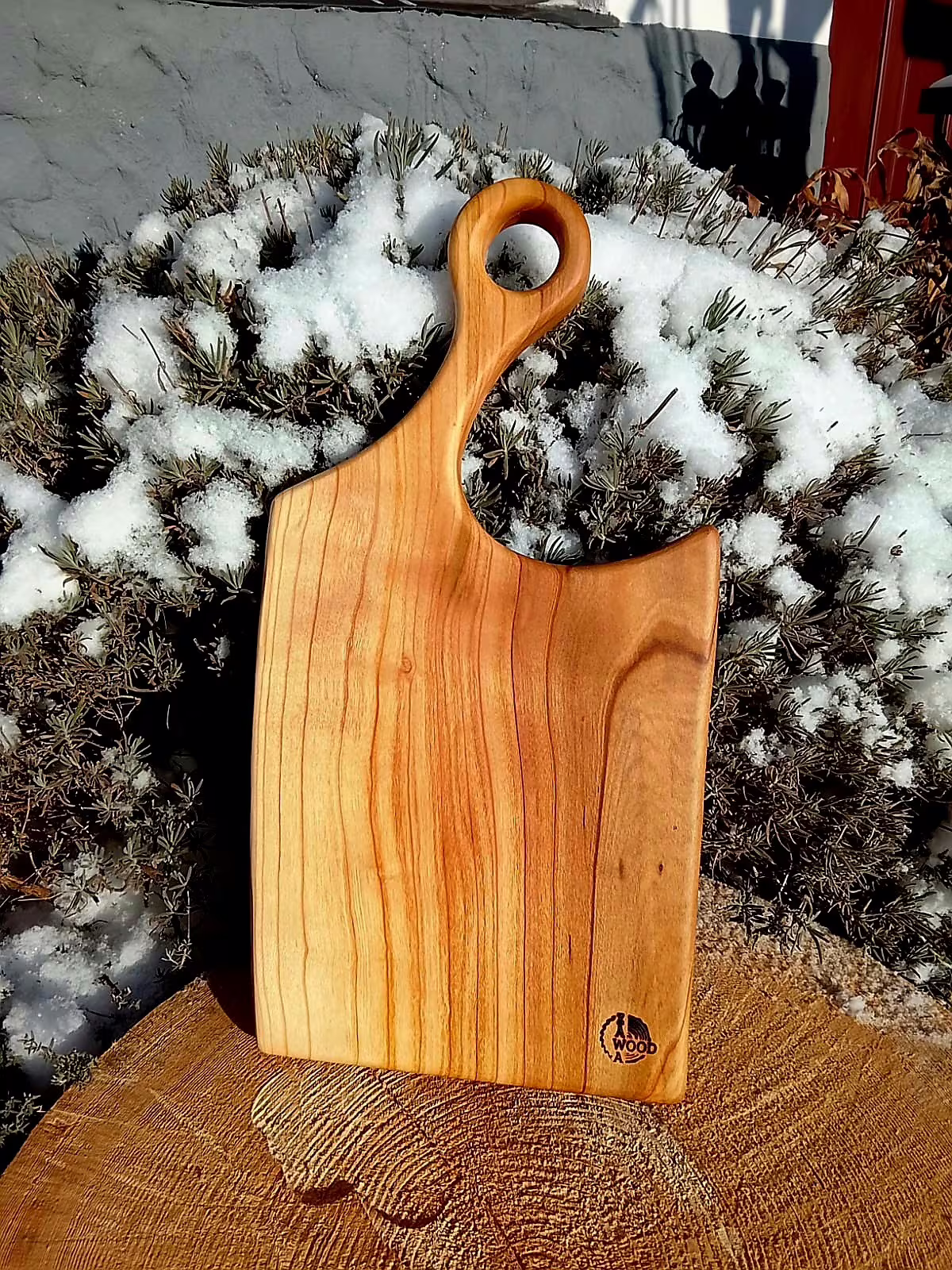 Ručně vyrobené prkénko z jednoho kusu staré třešně, která rostla u potoka pod rybníkem na Vysočině. Strom jsem sám pokácel, dřevo nařezal na vlastní pile a tři roky přirozeně sušil ve stodole.