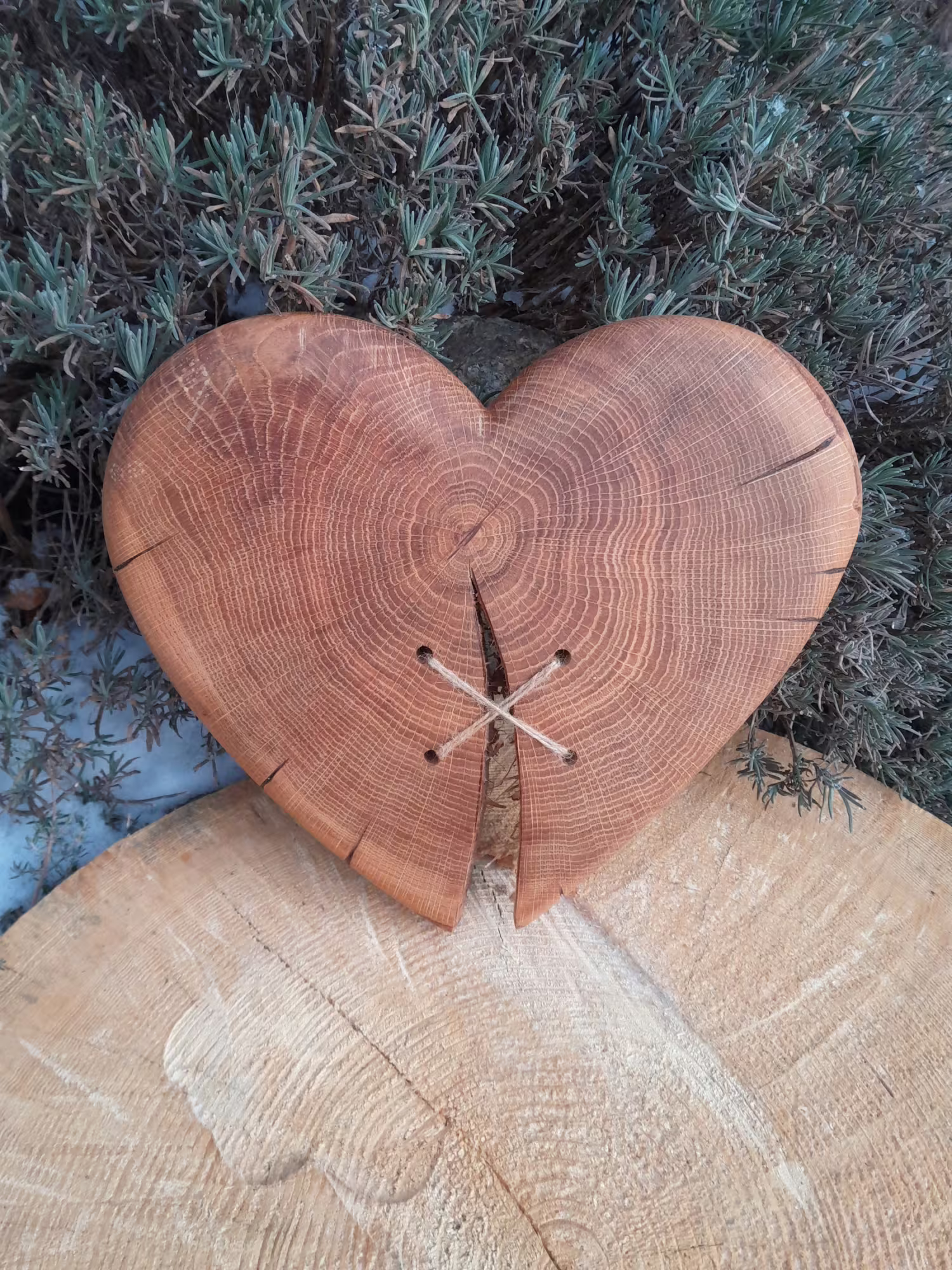 Srdce z lásky je masivní dekorativní objekt vyrobený z příčného řezu dubového kmene. Právě tento řez odhaluje to nejcennější, co dřevo nese – letokruhy, praskliny vzniklé časem a přirozený střed stromu, který vypráví jeho příběh.