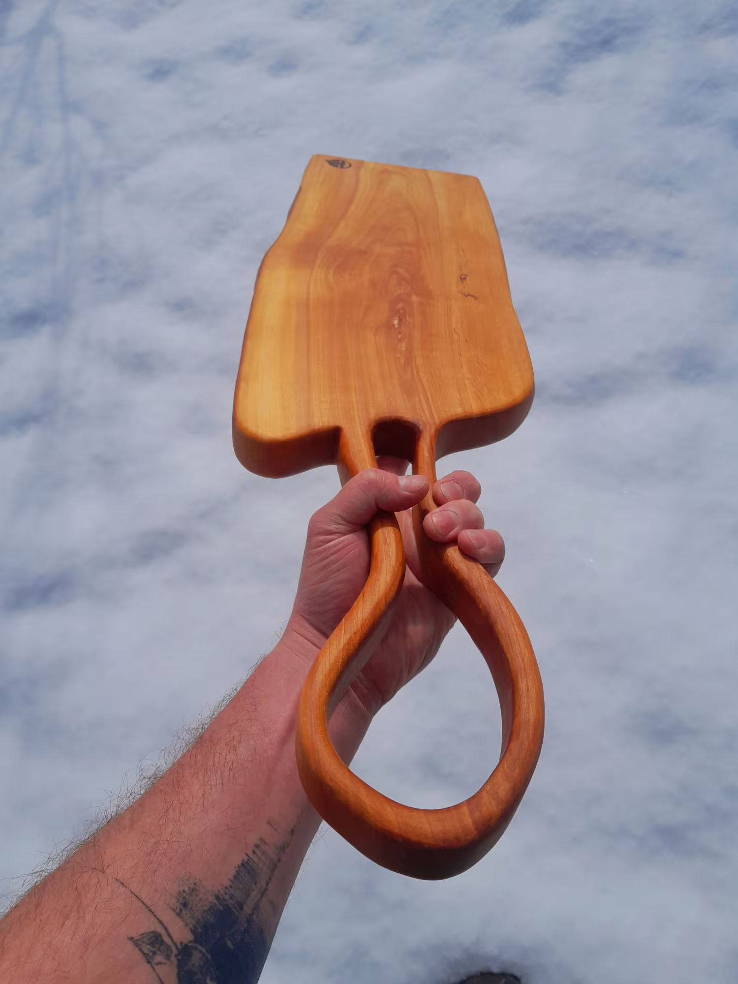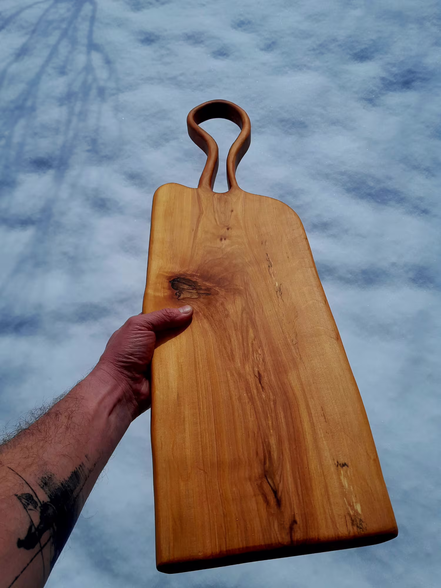 Dominantním prvkem prkna je velké ručně tvarované oko rukojeti, které dodává kusu sochařský charakter a zároveň zajišťuje pohodlné držení i zavěšení. Prkno je ideální pro servírování, prezentaci jídla nebo jako výrazný solitér do kuchyně či interiéru.